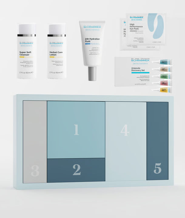 Der sanfte Reiniger in Miniaturgröße befreit die Haut schonend von Schmutz und Make-up, während das erfrischende Tonic (Miniatur) die Haut klärt und optimal auf die nachfolgende Pflege vorbereitet. Die Feuchtigkeitscreme in Originalgröße versorgt die Haut intensiv mit Feuchtigkeit und schenkt ein geschmeidiges Hautgefühl. Ein besonderes Highlight ist das Ampullenset mit fünf verschiedenen Wirkstoffampullen, die gezielt auf unterschiedliche Hautbedürfnisse eingehen – für sichtbar gepflegte und vitalisierte Haut. Abgerundet wird das Set durch eine Packung Augenpads, die die empfindliche Augenpartie erfrischen, glätten und beleben. Ein vielseitiges Pflegeset; perfekt als Geschenk oder zum Selbstverwöhnen.